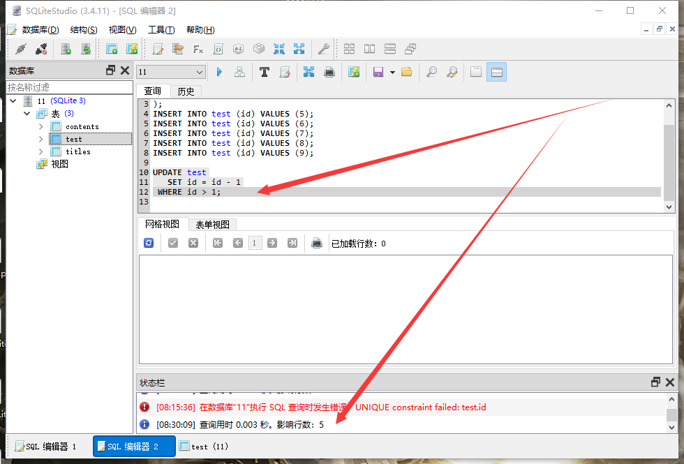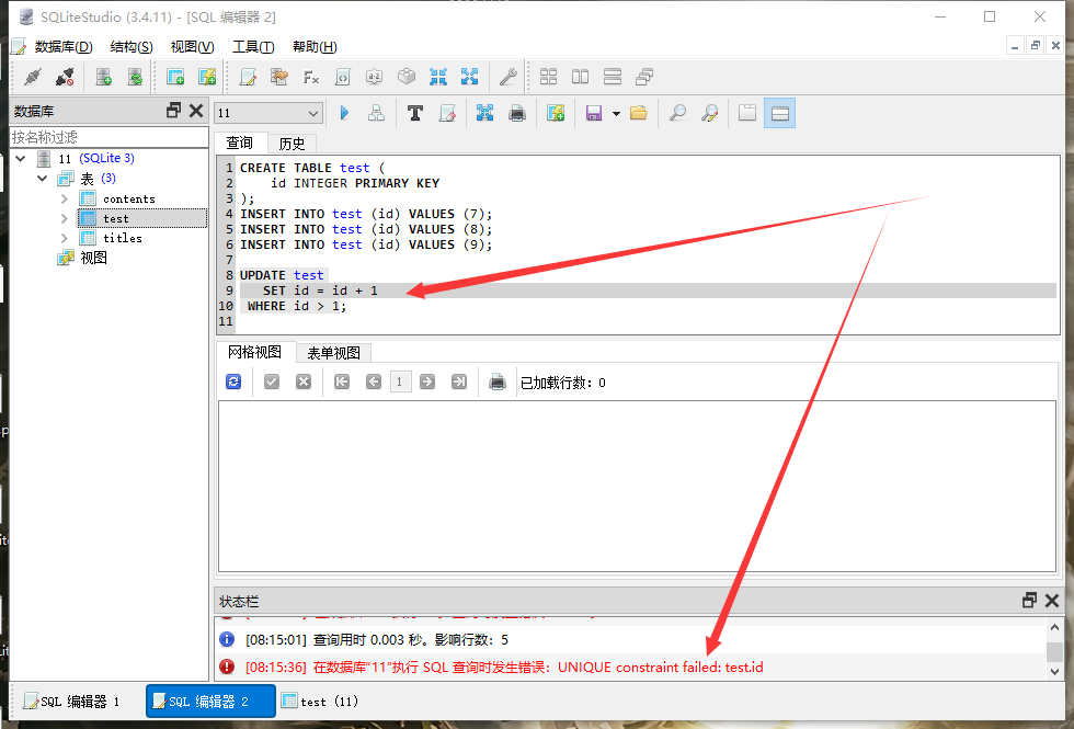 如图,这SQLIte有什么特性吗 肯定不是事务的问题,首先这个SQLiteStudio视每一条语句为一个事务,其次它有一个成功了。 这个问题源于我写C#,遇到了+1可以-1不行的事情,所以写了个测试,结果测试+1不行-1可以。
