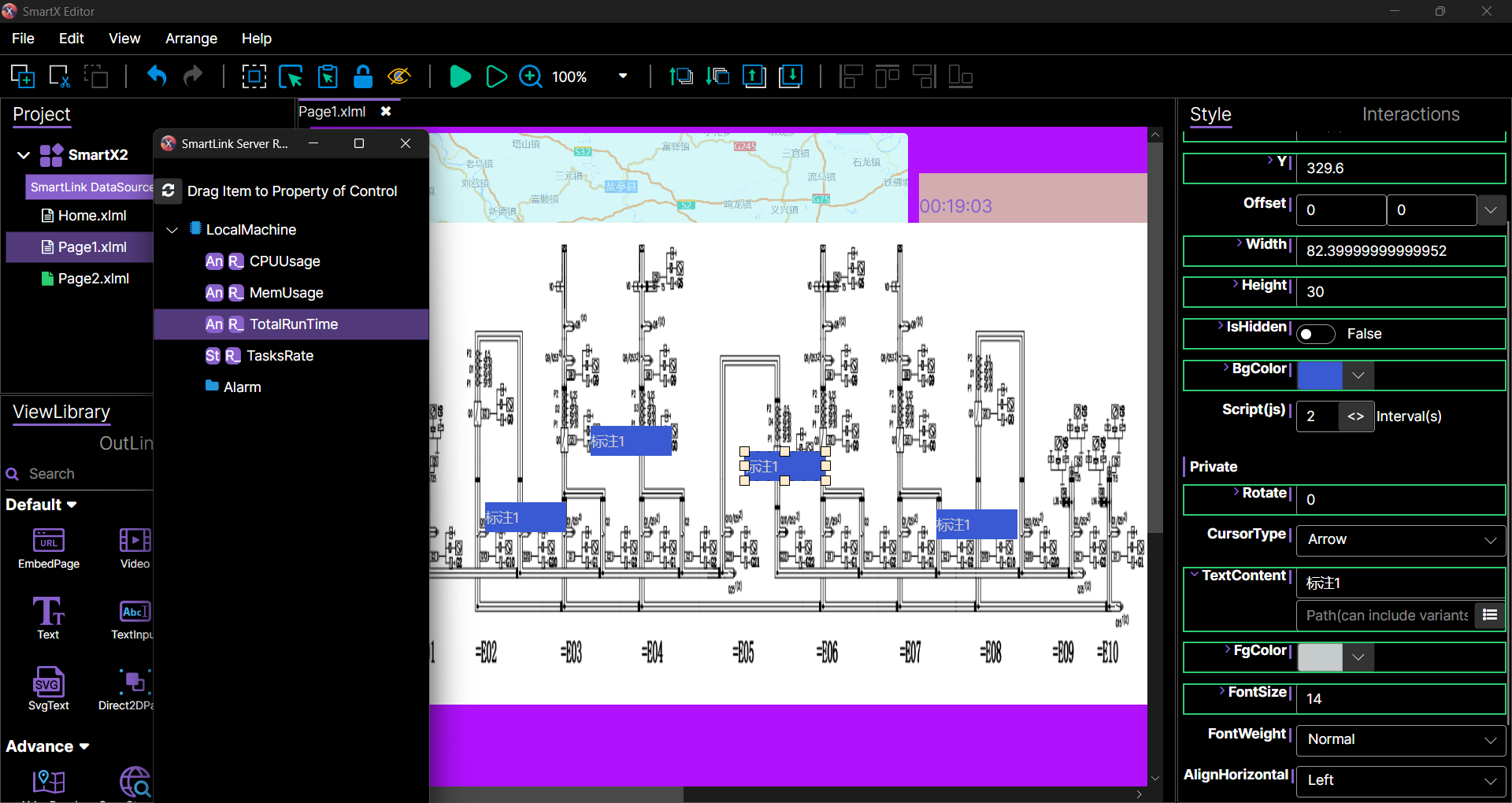 上图Running调试,显示已绑定点位数据。类似axture,比axture多更多的“(动态)面板”(如列出来的地图面板),比axture还多数据bind以及脚本(简单项目不用写脚本);