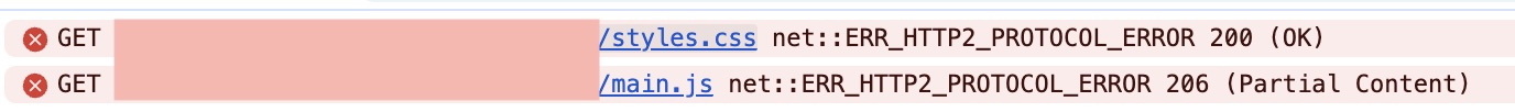 今天测试访问 staging 环境部署的 web 应用时,页面一片空白,打开浏览器的开发者工具控制台一看,请求 css 与 js 文件都出现 "net::ERR_HTTP2_PROTOCOL_ERROR 200 (OK)" 错误