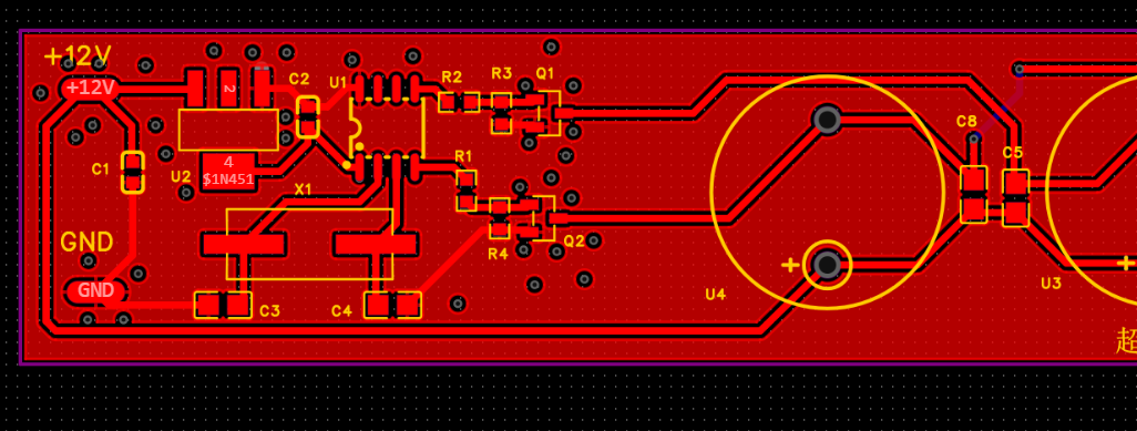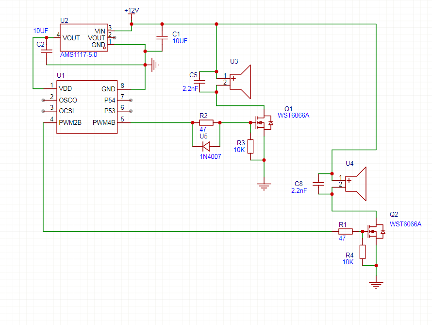 我这个电路哪里有问题?1117IC不加电容正常工作,加了两个滤波电容直接把芯片烧了,输出和输出都通路了,后面我就不加电容直接用1117给MCU供电,MCU两路都正常输出PWM 形,在超声波发射头焊接到板子上,用示波器测试mos管的漏极(D)的,另一端接地波形会失真,并且输出波形的幅值也有问题,麻烦大家指导一下,哪里有问题!