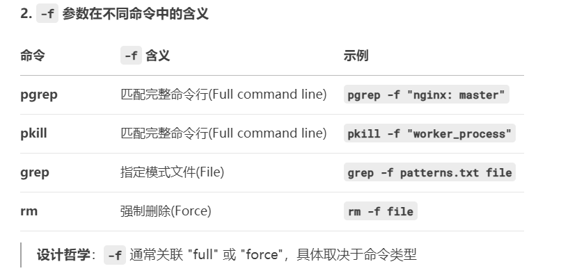 -f 完整匹配/文件/强制/完整格式上下文敏感:不同工具不同含义