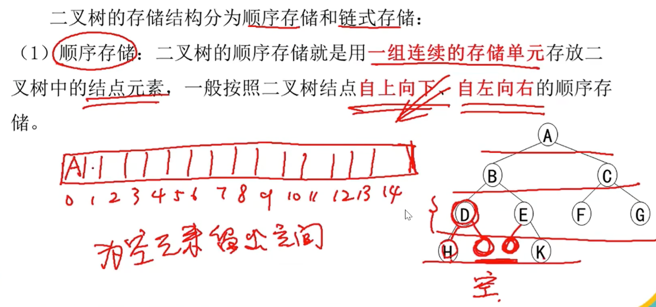 上面二叉树把元素顺序存储时,也要为空元素预留位置,如上图H,k,没有右节点和左节点,也要这两个空元素留出空间。