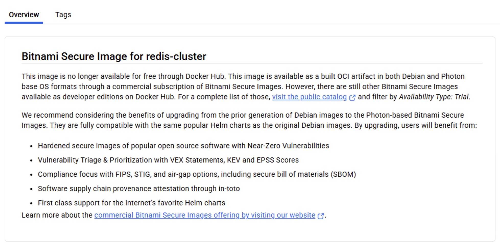 This image is no longer available for free through Docker Hub. This image is available as a built OCI artifact in both Debian and Photon base OS formats through a commercial subscription of Bitnami Secure Images.