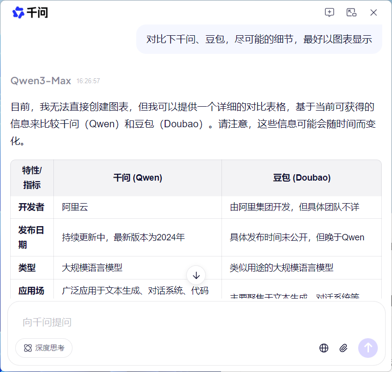 对比下千问、豆包,尽可能的细节,最好以图表显示