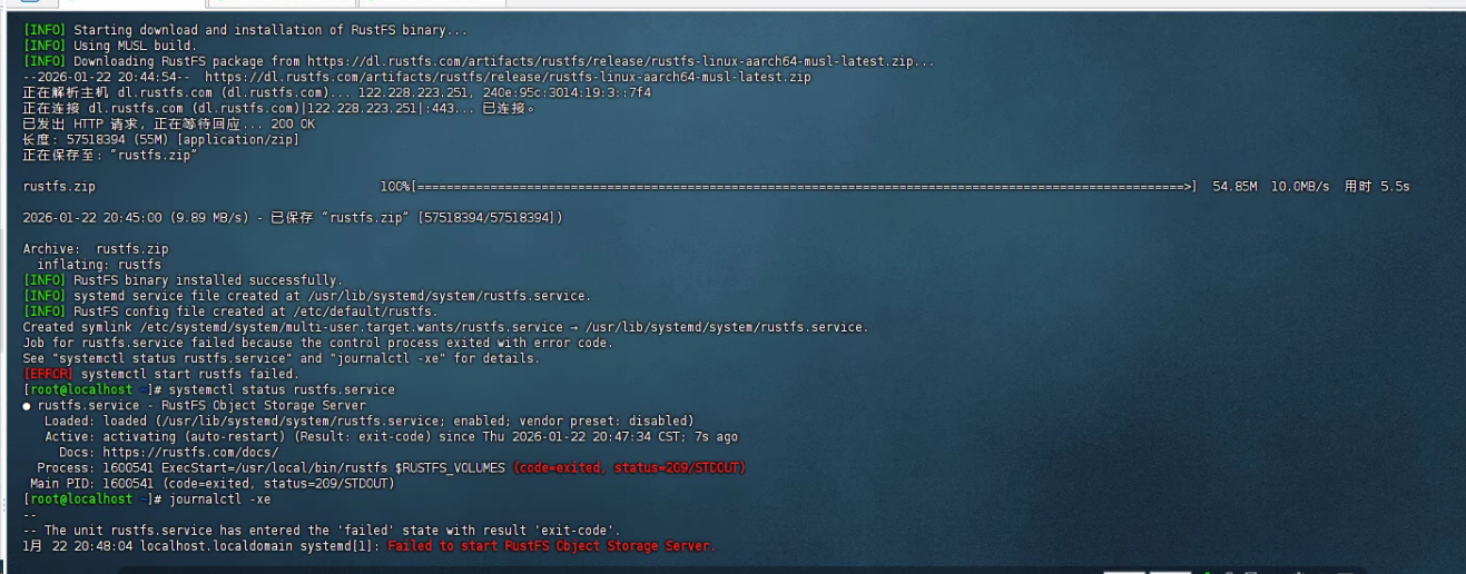 rustfs 麒麟v10 安装完,启动不了大佬帮忙看看啥意思