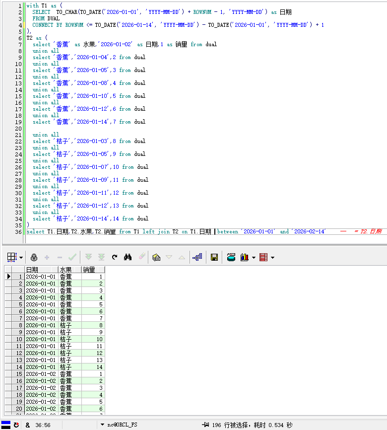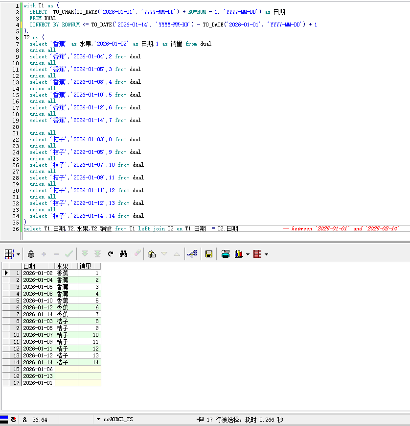 如下图示,Oracle10g的环境,水果的销量数据,如何补充完整的日期档案?